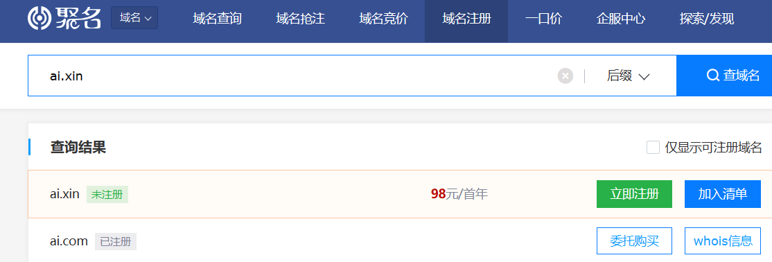 刚在聚名随便搜个ai.xin竟然可以注册