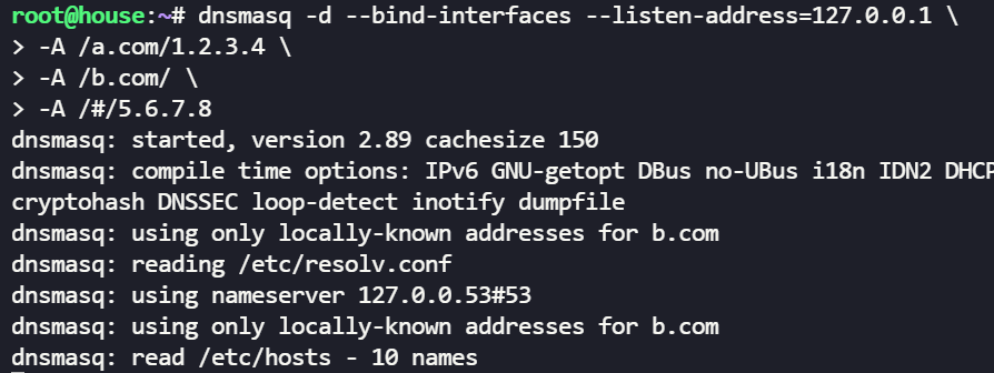 dnsmasq -d --bind-interfaces --listen-address=127.0.0.1 -A /a.com/1.2.3.4 -A /b.com/ -A /#/5.6.7.8本地没有配置的域名(本地配置优先,可以覆盖公网解析),dnsmasq 可以向上游 DNS 服务器请求解析。