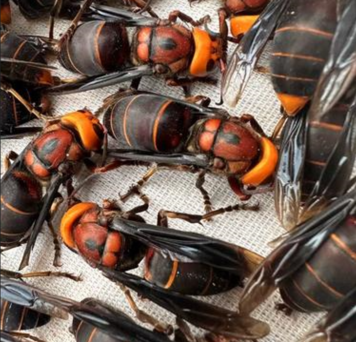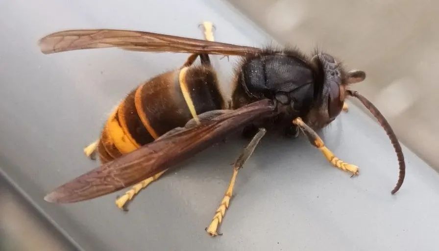 金环胡蜂:俗称:“虎头蜂”,“大土蜂”,体型较大,30-35mm,最大45-50mm,显著特点为:头部黄色,远看像老虎头,中胸背板黑色,腹部桔黄色具有金黄色环纹。