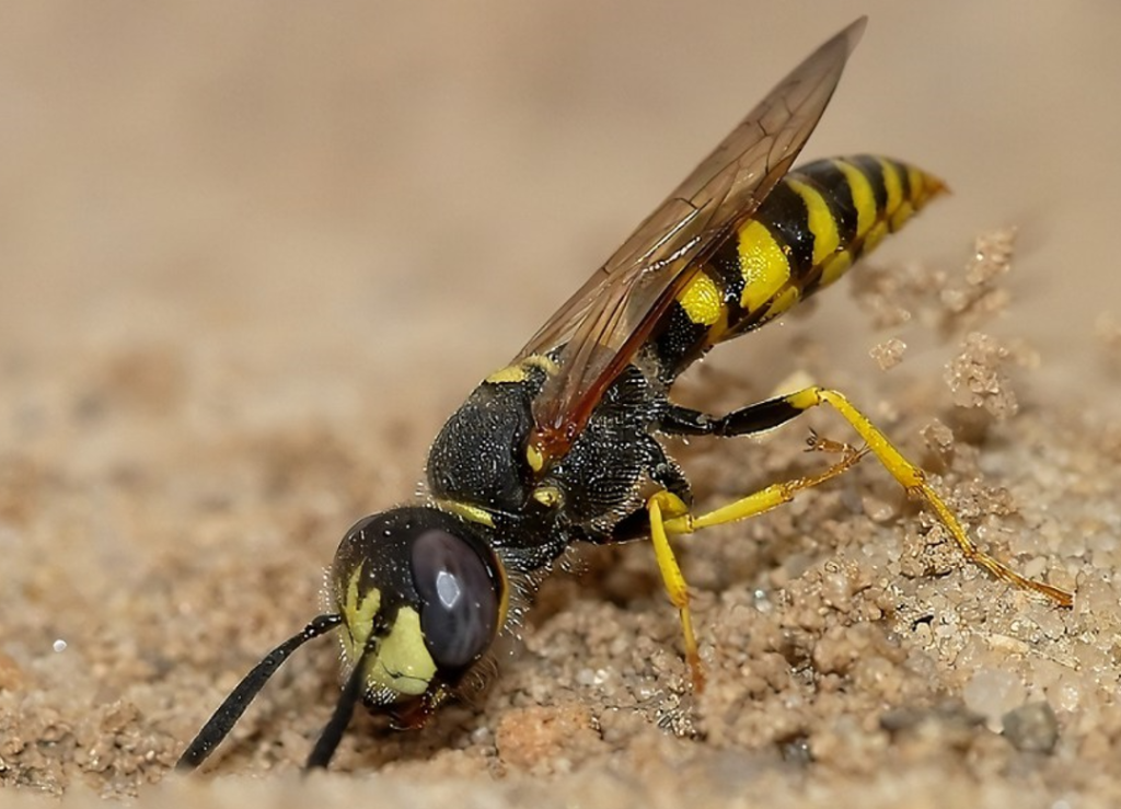 蜂狼,也被称为大头泥蜂,蜂狼体长约为15毫米,头大,胸部黑色,腹部鲜黄色,头前部有较大的白斑。