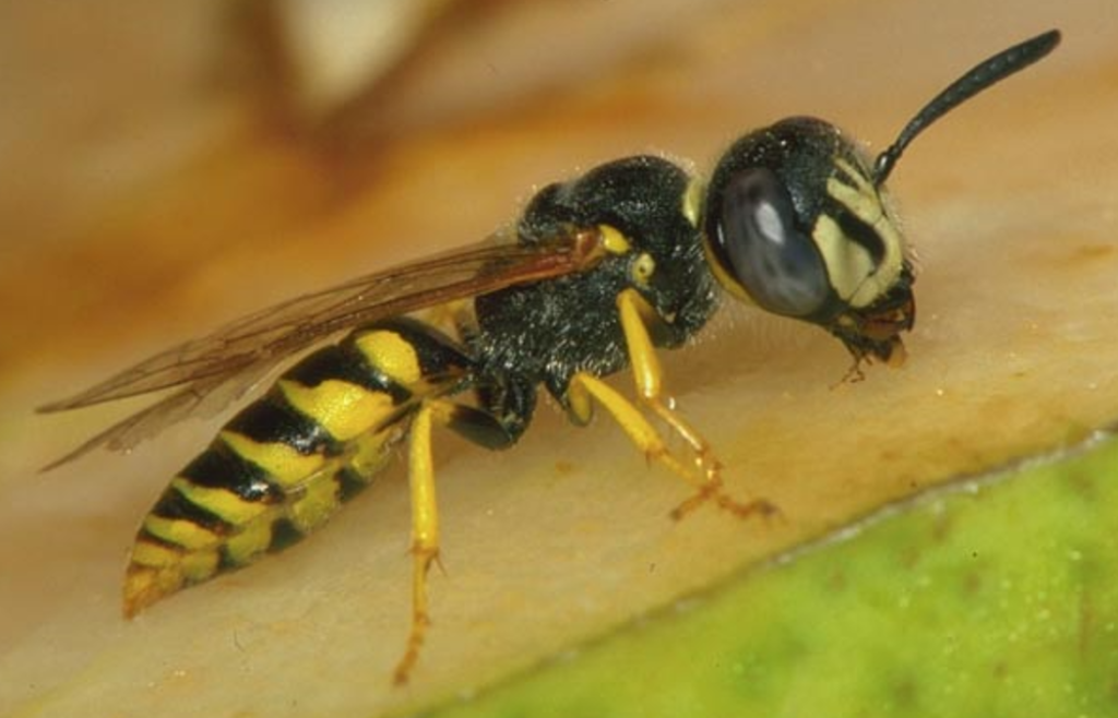 黑盾胡蜂,又称双色胡蜂,黄色胡蜂,体细,黄色,或红黑色,胸部有黑色小盾片。